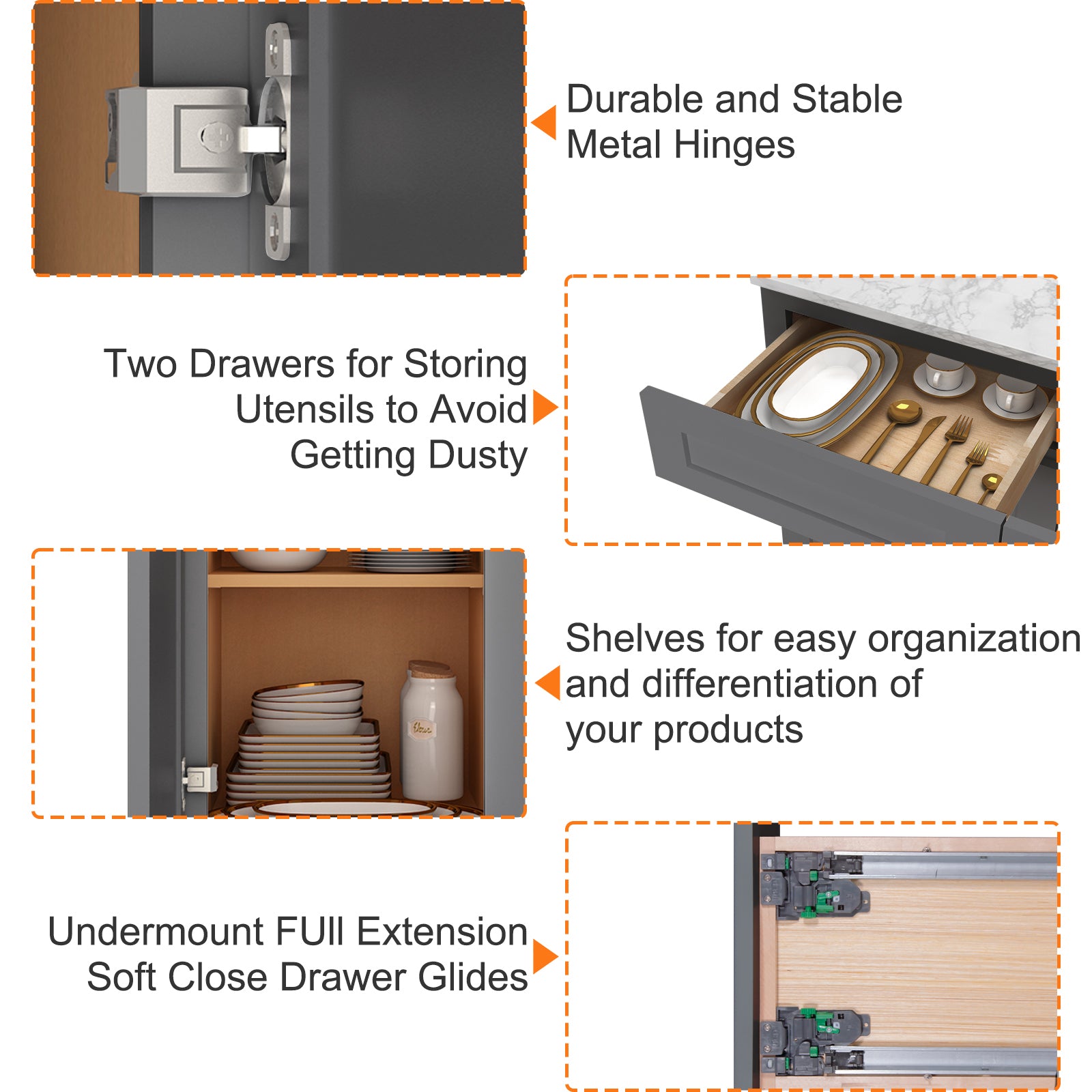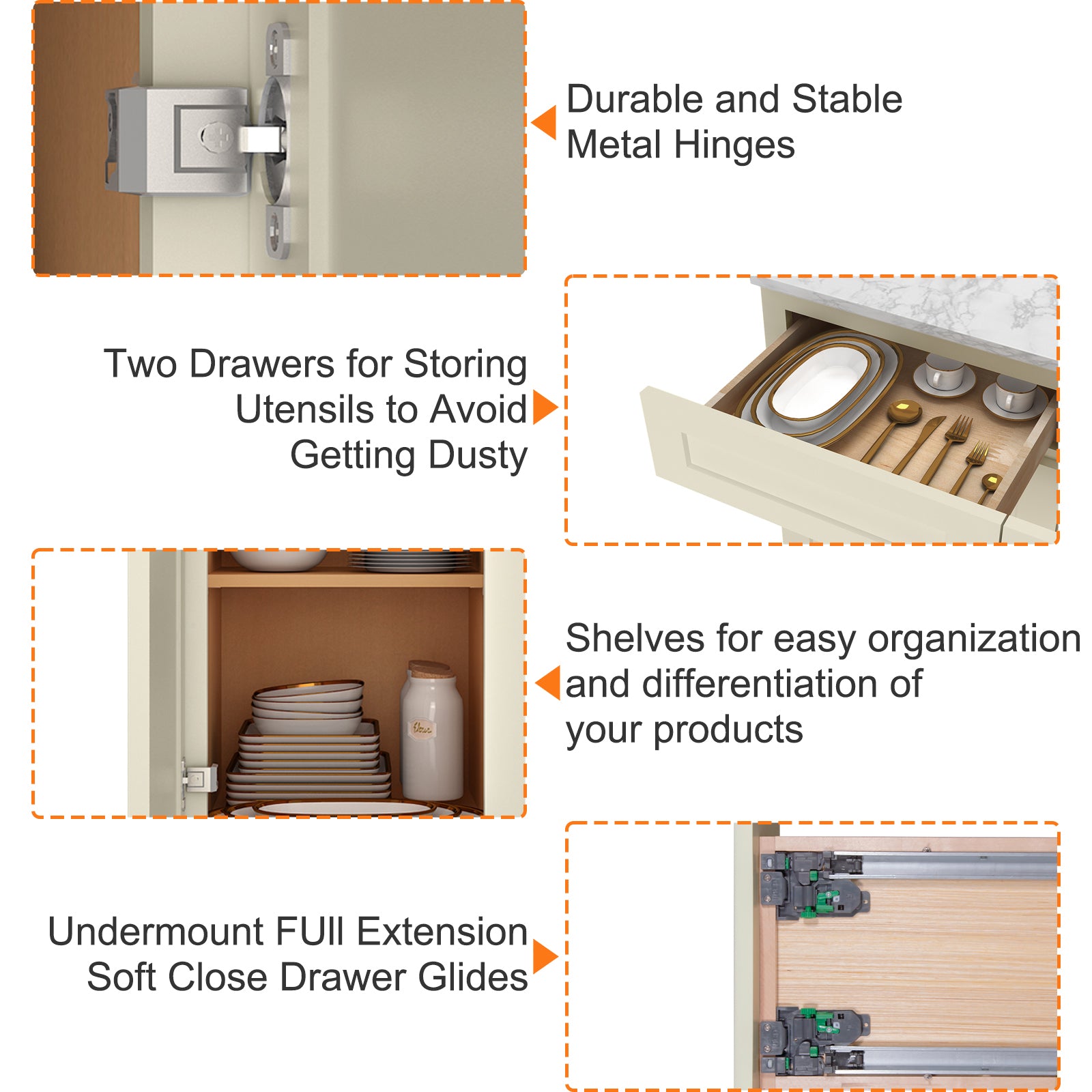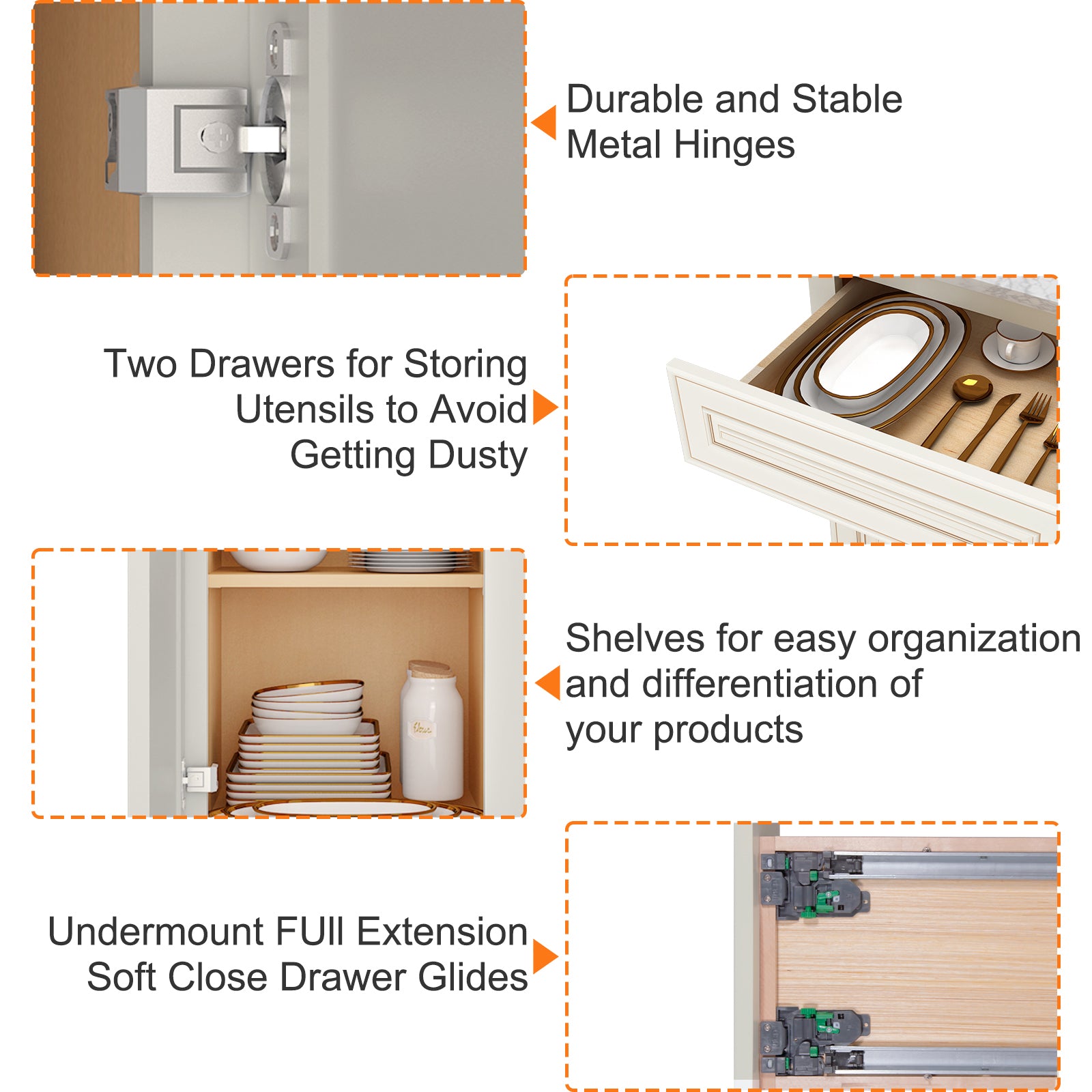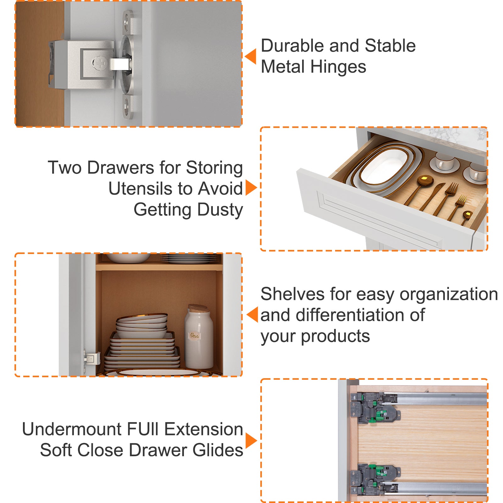 The interior of the base cabinet is equipped with pre-built screw holes to install the bearing plate (please note: the base cabinet does not come with a bearing plate) or separately purchased drawers, according to the needs of the layout of the storage space can be adjusted.