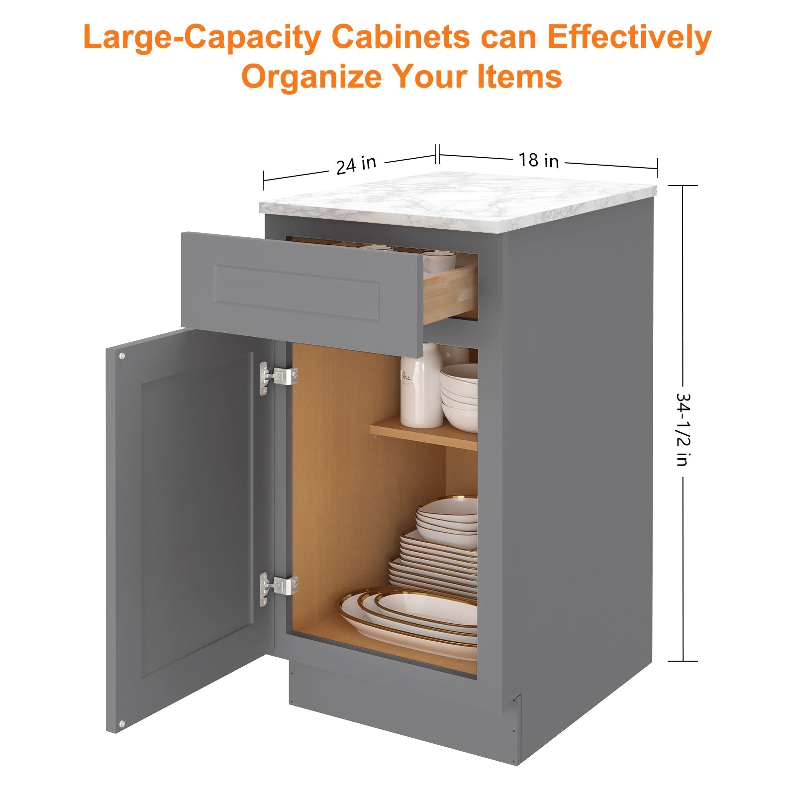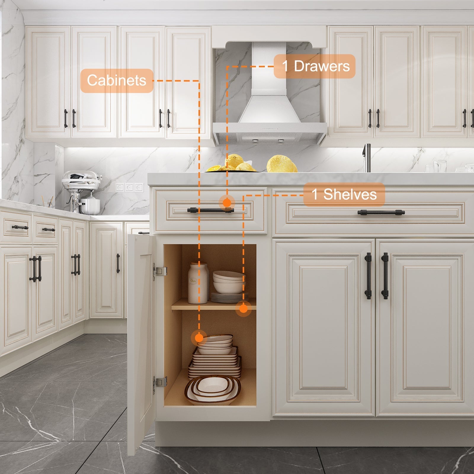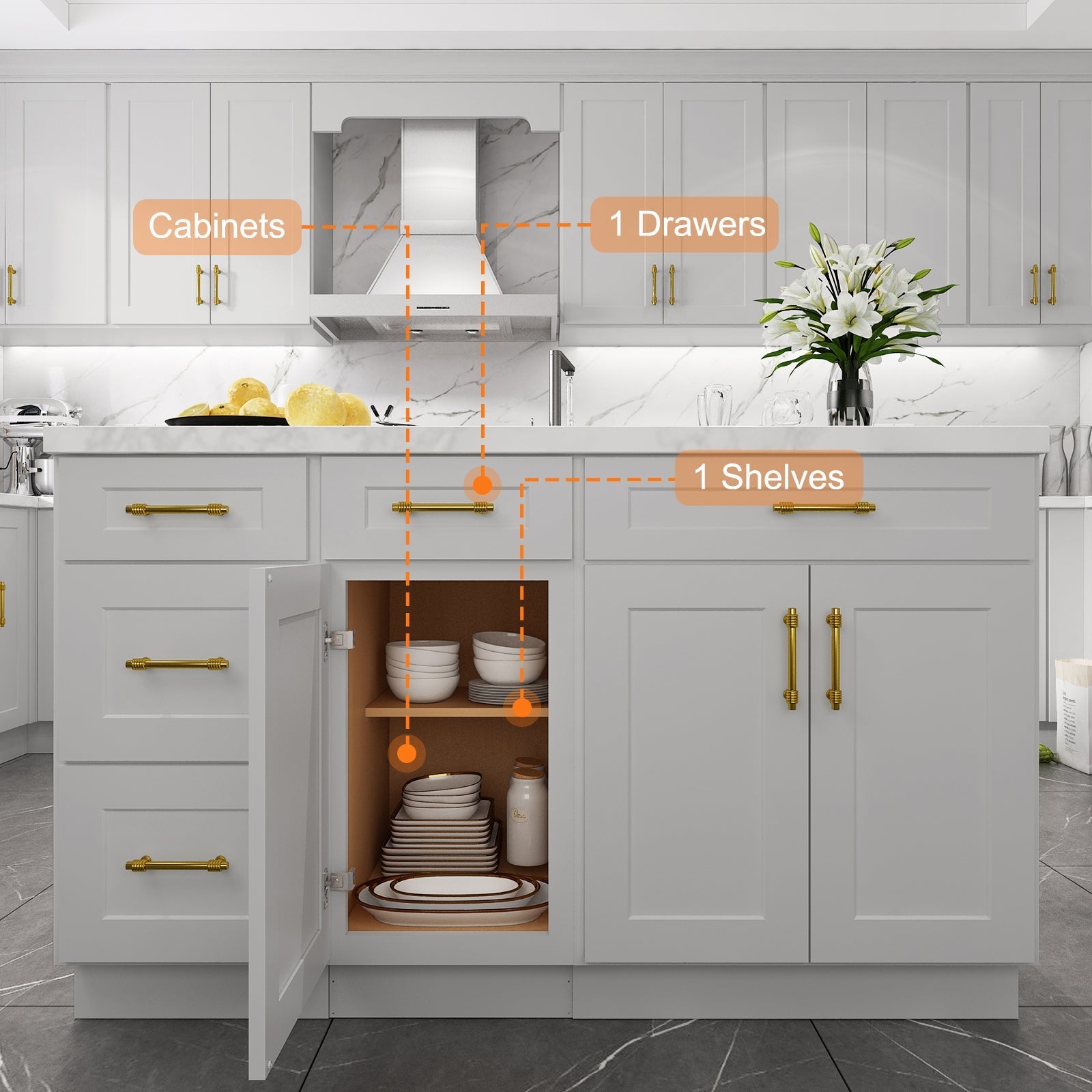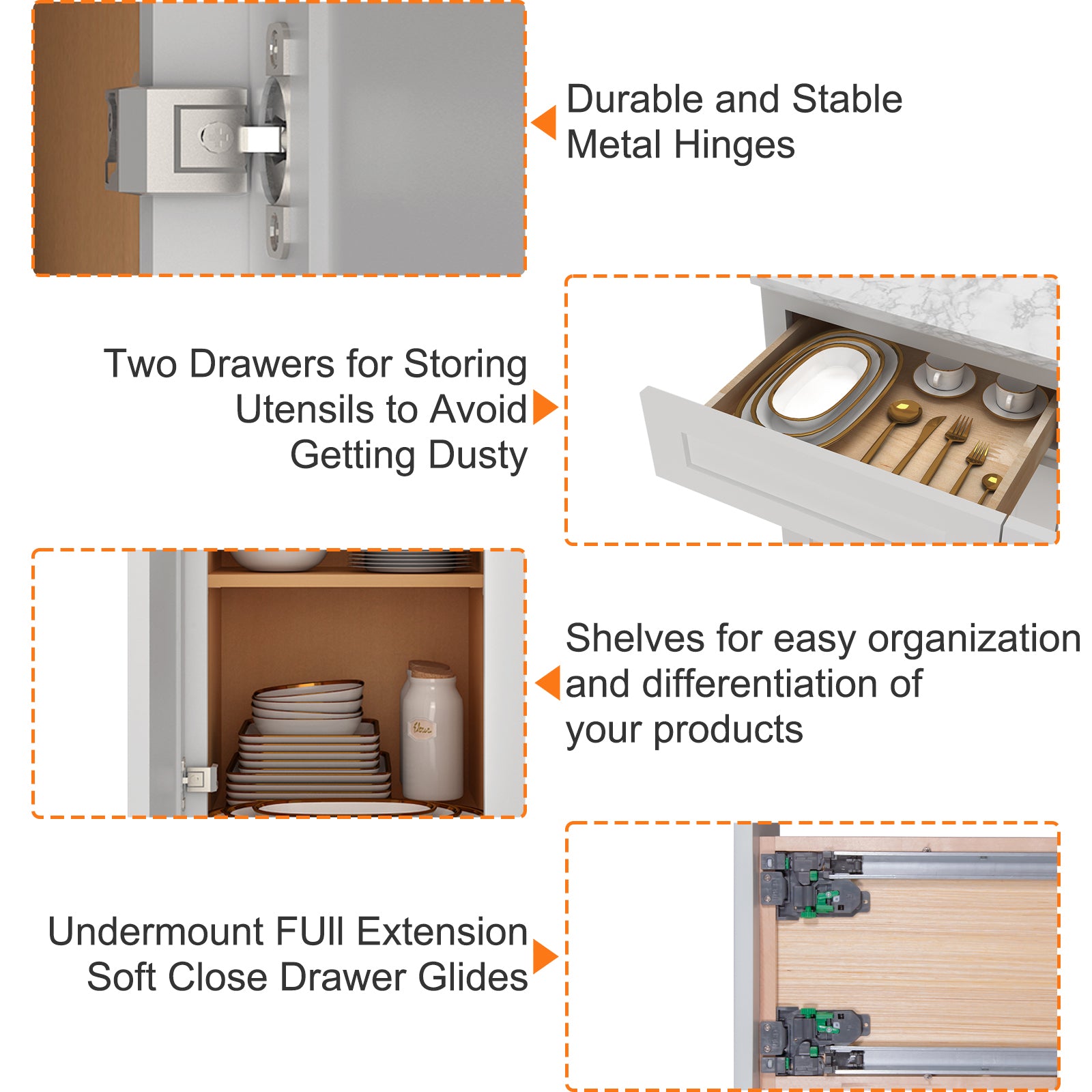 The interior of the base cabinet is equipped with pre-built screw holes to install the bearing plate (please note: the base cabinet does not come with a bearing plate) or separately purchased drawers, according to the needs of the layout of the storage space can be adjusted.